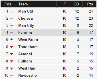Eftir 10 leiki er Everton því með 17 stig (1.7 stig er ágætis afrakstur per leik), 19 mörk skoruð (næstum tvö mörk í leik, sem er ansi gott — aðeins þrjú önnur lið hafa gert betur) og 13 mörk á sig (1.3 per leik), sem er aðeins of mikið en Moyes veit hvernig á að spila varnarleik og nær örugglega að þétta þetta þegar á líður. Mann langar líka mikið að sjá Gibson taka við hlutverki varnarsinnaða miðjumannsins, sem Neville hefur verið að leysa hann af í vegna meiðsla Gibson.